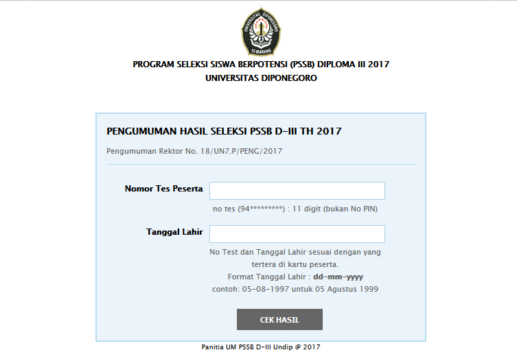 Pengumuman Hasil Seleksi PSSB D-III Th. 2017