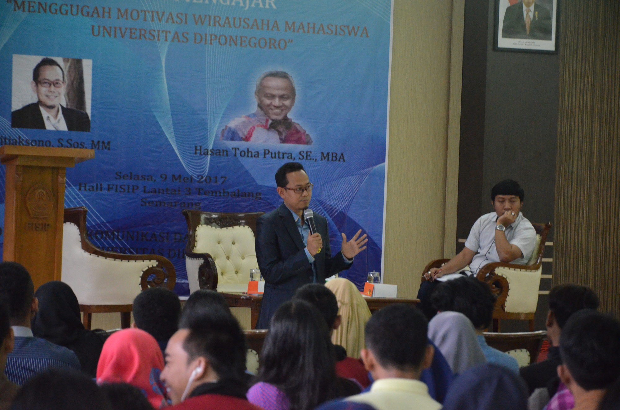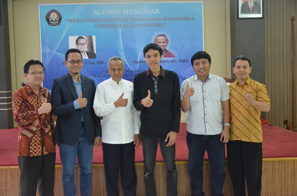 “Ada tiga alumni yang diundang dalam acara ini yaitu M. Agung Baiquni, pengusaha muda, baru saja diwisuda Oktorber 2016, alumni FISIP telah memiliki PT. BB ( Baiquni Brother ), lalu Witjaksono, S.Sos. alumni FISIP angkatan 2010 yang memiliki bisnis kapal dan alumni senior yaitu Hasan Toha Putra, SE., MBA lulusan Fakultas Ekonomi, mengelola yayasan badan wakaf Sultan Agung, memiliki percetakan dan usaha bidang properti” papar Ketua Panitia,Abdul Syakur dalam laporan singkat saat pembukaan acara.
