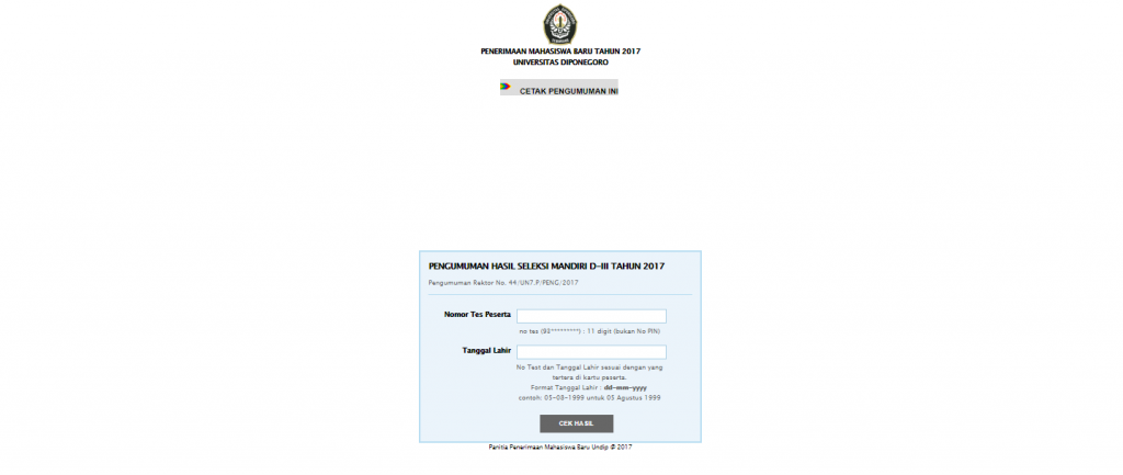 LIHAT PENGUMUMAN Jadwal Pembayaran Biaya Pendidikan dan Verifikasi-Registrasi Calon Mahasiswa Baru Program Diploma Jalur Seleksi Mandiri Tahun Akademik 2017-2018 Rektor Universitas Diponegoro dengan ini mengumumkan bagi peserta yang dinyatakan lolos seleksi sebagai calon mahasiswa baru program Diploma Universitas Diponegoro melalui jalur Seleksi Mandiri Tahun Akademik 2017/ 2018, wajib melaksanakan […]