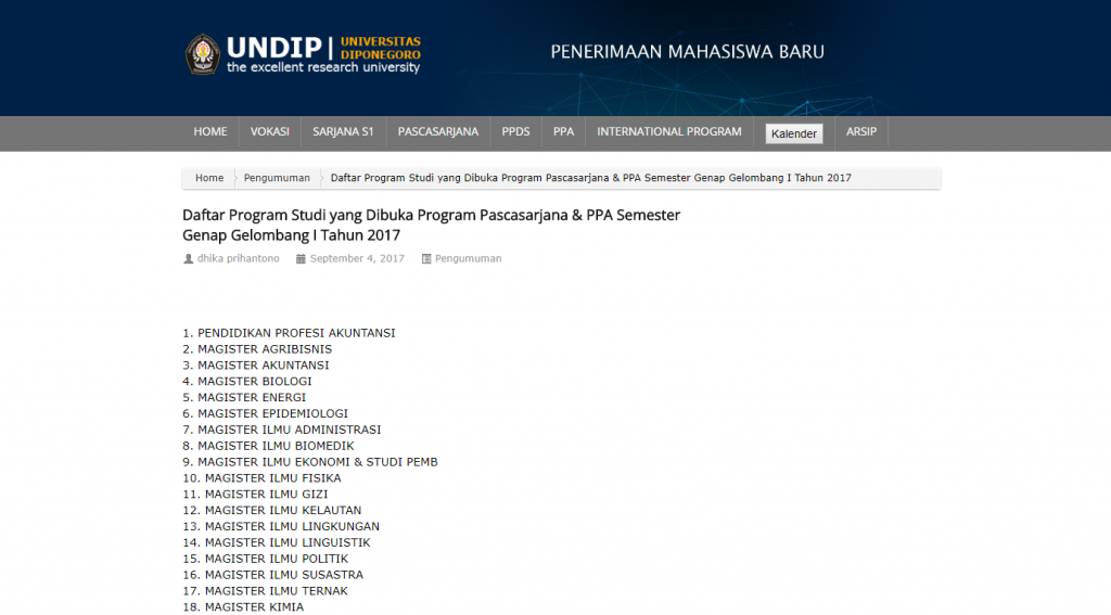 Daftar Program Studi yang Dibuka Program Pascasarjana & PPA Semester Genap Gelombang I Tahun 2017 1. PENDIDIKAN PROFESI AKUNTANSI 2. MAGISTER AGRIBISNIS 3. MAGISTER AKUNTANSI 4. MAGISTER BIOLOGI 5. MAGISTER ENERGI 6. MAGISTER EPIDEMIOLOGI 7. MAGISTER ILMU ADMINISTRASI 8. MAGISTER ILMU BIOMEDIK 9. MAGISTER ILMU EKONOMI & STUDI […]