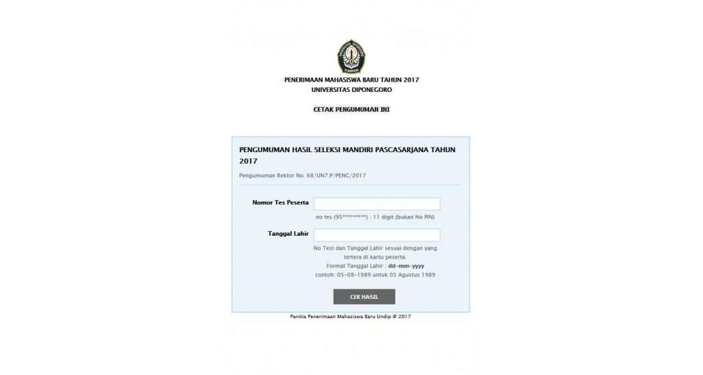 Pengumuman Hasil Seleksi Mandiri Pasca Sarjana Gelombang I Semester Genap 2017 silahkan CEK DISINI Informasi Registrasi Ulang akan diumumkan Senin, 4 Desember 2017 melalui laman www.baa.undip.ac.id / www.um.undip.ac.id sumber : https://um.undip.ac.id/