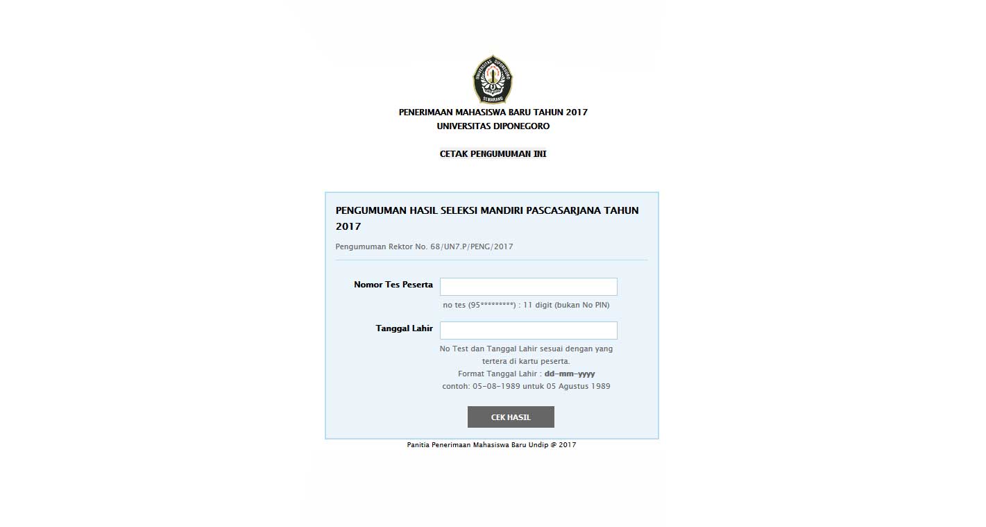 Informasi Registrasi Ulang akan diumumkan Senin, 4 Desember 2017 melalui laman www.baa.undip.ac.id / www.um.undip.ac.id