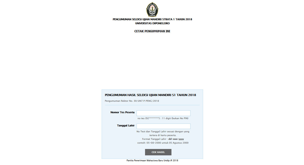 Pengumuman jalur ujian mandiri tahun 2018 dapat dilihat di link >> http://pengumuman.um.undip.ac.id