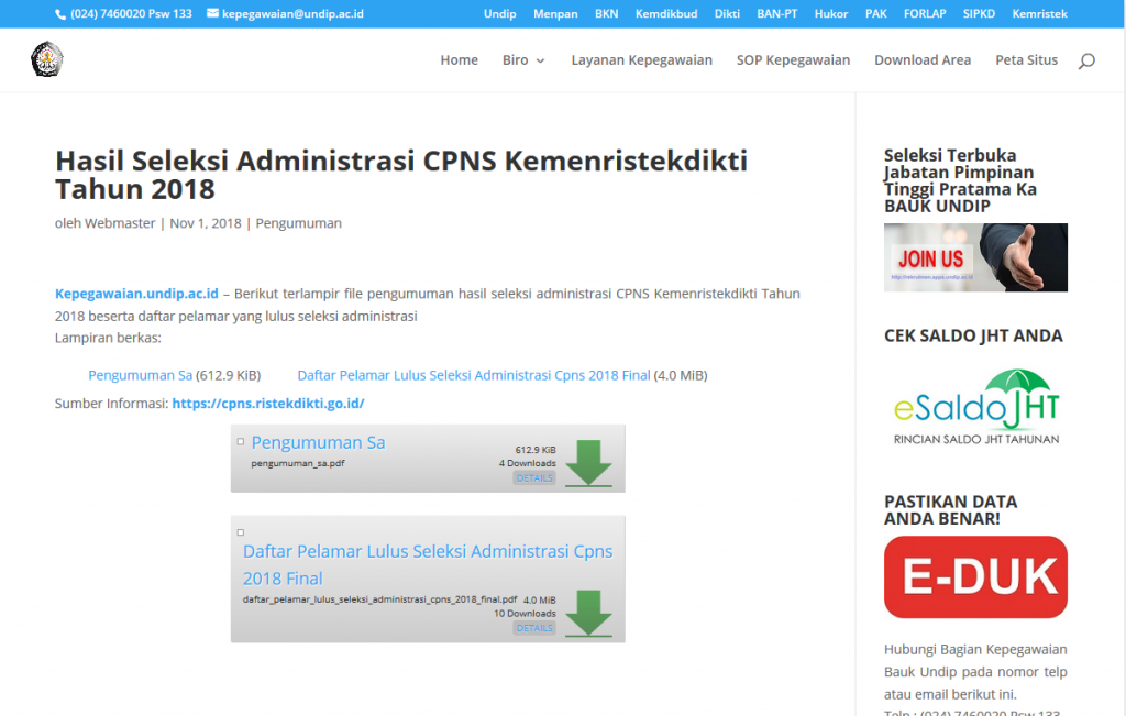 Kepegawaian.undip.ac.id – Berikut terlampir file pengumuman hasil seleksi administrasi CPNS Kemenristekdikti Tahun 2018 beserta daftar pelamar yang lulus seleksi administrasi Lampiran berkas: Pengumuman & Daftar Pelamar Lulus Seleksi Administrasi Cpns 2018 Final Sumber Informasi: https://cpns.ristekdikti.go.id/ sumber : http://kepegawaian.undip.ac.id