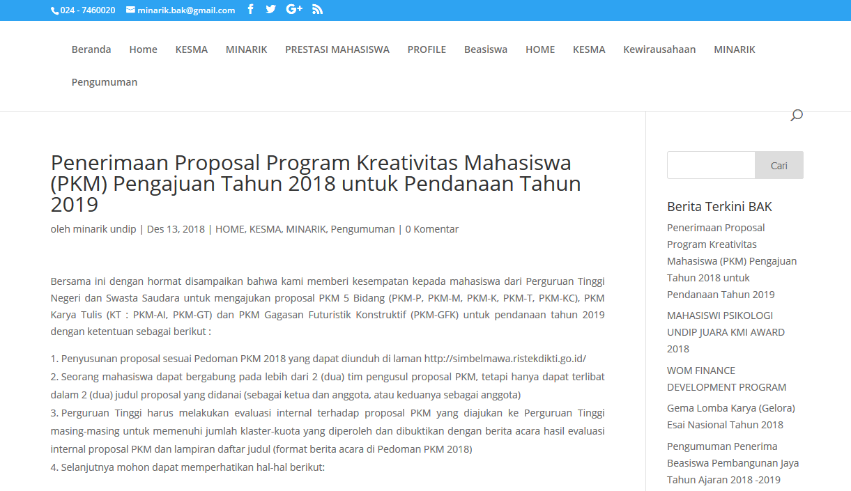 Bersama ini dengan hormat disampaikan bahwa kami memberi kesempatan kepada mahasiswa dari Perguruan Tinggi Negeri dan Swasta Saudara untuk mengajukan proposal PKM 5 Bidang (PKM-P, PKM-M, PKM-K, PKM-T, PKM-KC), PKM Karya Tulis (KT : PKM-AI, PKM-GT) dan PKM Gagasan Futuristik Konstruktif (PKM-GFK) untuk pendanaan tahun 2019 dengan ketentuan sebagai berikut :