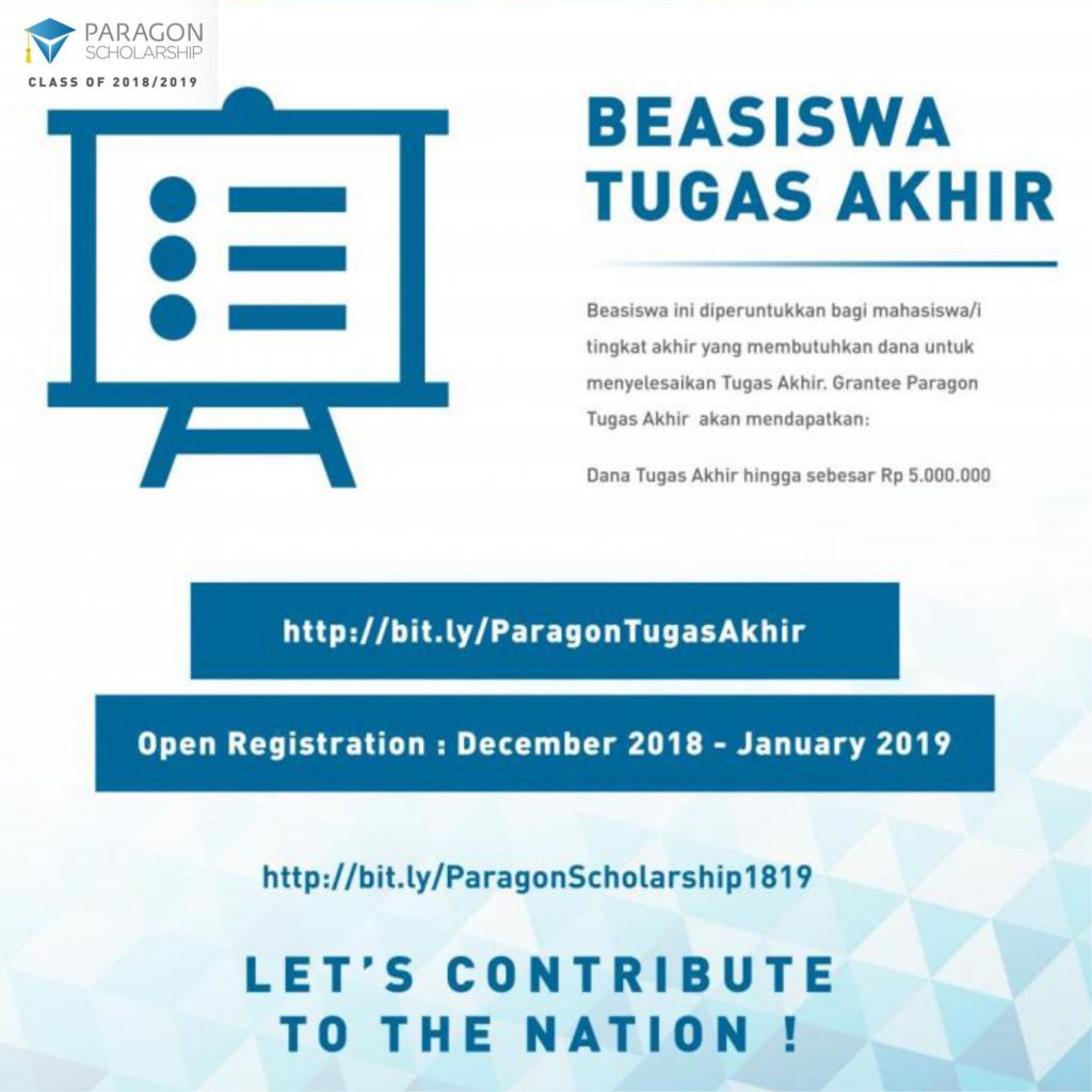 PT Paragon Technology and Innovation membuka registrasi pendaftaranBeasiswa Tugas Akhir. Beasiswa ini diperuntukan bagi mahasiswa/mahasiswi tingkatakhir yang membutuhkan dana untuk menyelesaikan Tugas Akhir dengan IPK minimal 3.00.Waktu pendaftaran:7 Desember 2018 – 7 Januari 2019. Persyaratan Pendaftaran Beasiswa Tugas Akhir, antara lain: