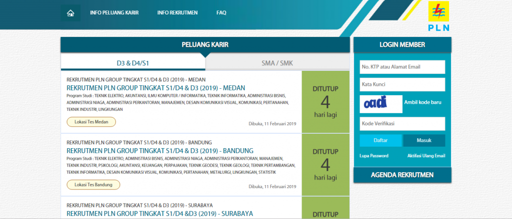 Waktu Pendaftaran : 11 – 14 Februari 2019 Lokasi Tes : Medan, Bandung, Surabaya, Yogyakarta Download pengumuman : REKRUTMEN PLN GROUP TINGKAT S1,D4,D3 LOKASI MEDAN REKRUTMEN PLN GROUP TINGKAT S1,D4,D3 LOKASI BANDUNG REKRUTMEN PLN GROUP TINGKAT S1,D4,D3 LOKASI SURABAYA REKRUTMEN PLN GROUP TINGKAT S1,D4,D3 LOKASI YOGYAKARTA Info lengkap : https://rekrutmen.pln.co.id