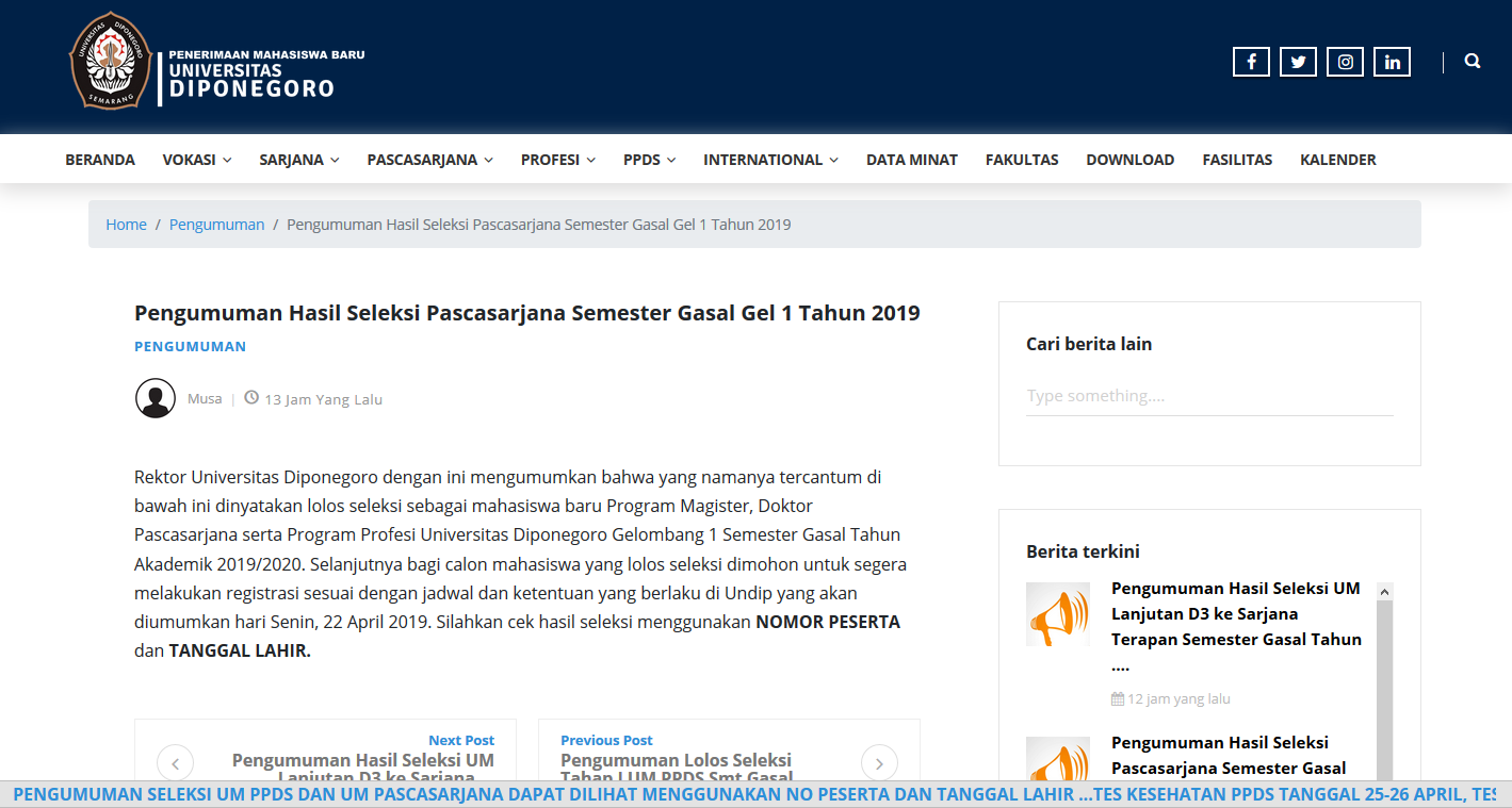 Rektor Universitas Diponegoro dengan ini mengumumkan bahwa yang namanya tercantum di bawah ini dinyatakan lolos seleksi sebagai mahasiswa baru Program Magister, Doktor Pascasarjana serta Program Profesi Universitas Diponegoro Gelombang 1 Semester Gasal Tahun Akademik 2019/2020. Selanjutnya bagi calon mahasiswa yang lolos seleksi dimohon untuk segera melakukan registrasi sesuai dengan jadwal dan ketentuan yang berlaku di Undip yang akan diumumkan hari Senin, 22 April 2019. Silahkan lihat hasil seleksi menggunakan NOMOR PESERTA dan TANGGAL LAHIR.