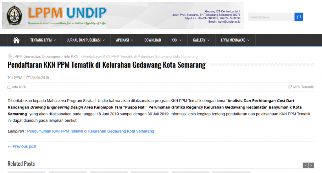 Diberitahukan kepada Mahasiswa Program Strata 1 Undip bahwa akan dilaksanakan program KKN PPM Tematik dengan tema “Analisis Dan Perhitungan Cost Dari Rancangan Drawing Engineering Design Area Kelompok Tani “Puspa Hati” Perumahan Grafika Regency Kelurahan Gedawang Kecamatan Banyumanik Kota Semarang“ yang akan dilaksanakan pada tanggal 18 Juni 2019 sampai dengan 30 Juli 2019. Informasi lebih lengkap […]