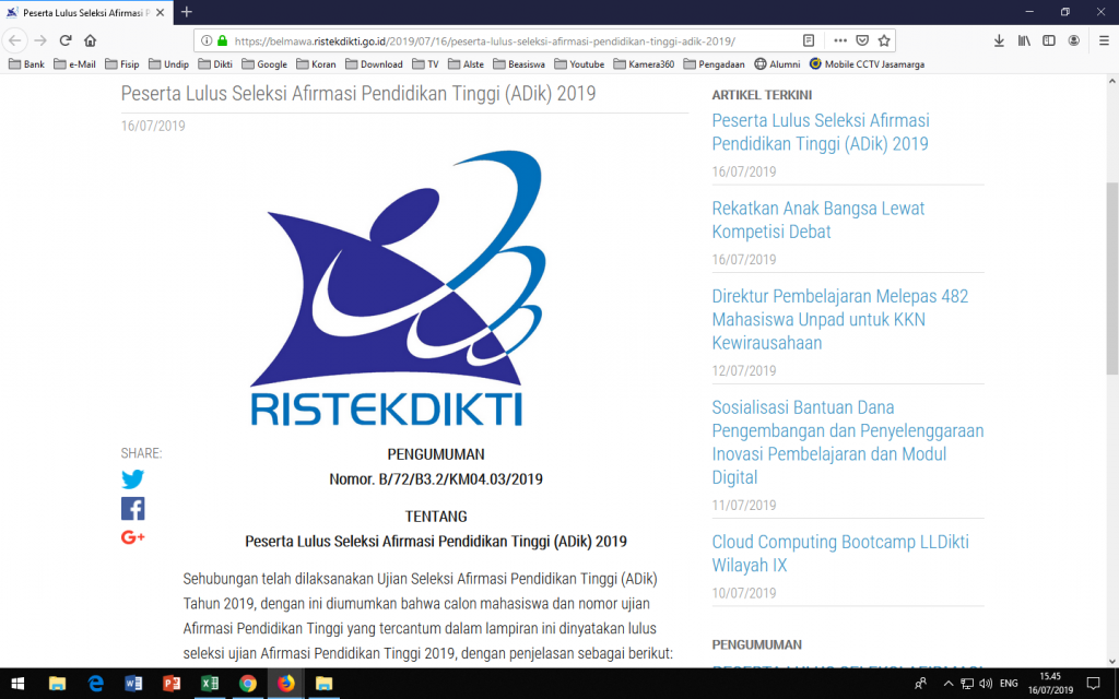 PENGUMUMAN Nomor. B/72/B3.2/KM04.03/2019 TENTANG Peserta Lulus Seleksi Afirmasi Pendidikan Tinggi (ADik) 2019 Sehubungan telah dilaksanakan Ujian Seleksi Afirmasi Pendidikan Tinggi (ADik) Tahun 2019, dengan ini diumumkan bahwa calon mahasiswa dan nomor ujian Afirmasi Pendidikan Tinggi yang tercantum dalam lampiran ini dinyatakan lulus seleksi ujian Afirmasi Pendidikan Tinggi 2019, dengan penjelasan sebagai berikut: Peserta lulus ditetapkan […]
