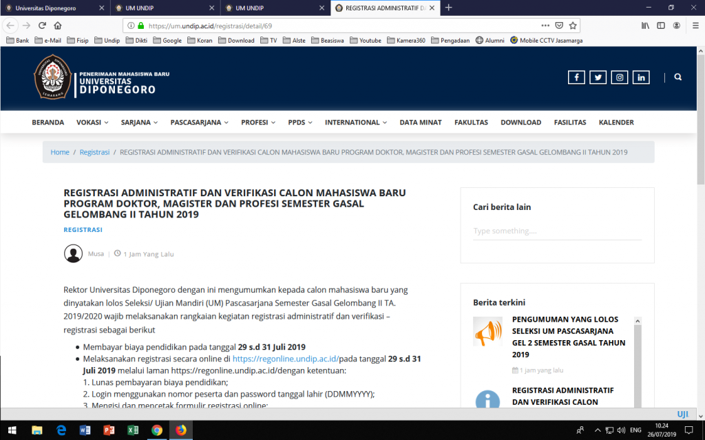 Rektor Universitas Diponegoro dengan ini mengumumkan kepada calon mahasiswa baru yang dinyatakan lolos Seleksi/ Ujian Mandiri (UM) Pascasarjana Semester Gasal Gelombang II TA. 2019/2020 wajib melaksanakan rangkaian kegiatan registrasi administratif dan verifikasi – registrasi sebagai berikut Membayar biaya pendidikan pada tanggal 29 s.d 31 Juli 2019 Melaksanakan registrasi secara online di https://regonline.undip.ac.id/pada tanggal 29 s.d 31 […]
