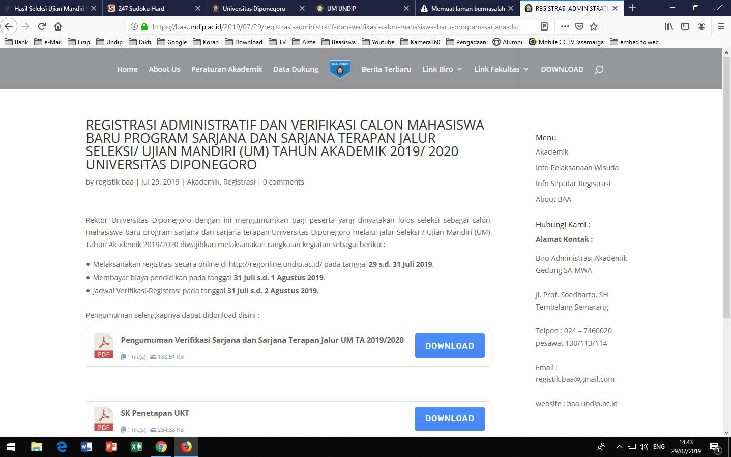 Registrasi Administratif dan Verifikasi Calon Mahasiswa Baru Program Sarjana dan Sarjana Terapan Jalur Seleksi/ Ujian Mandiri (UM) Tahun Akademik 2019/ 2020 Universitas Diponegoro