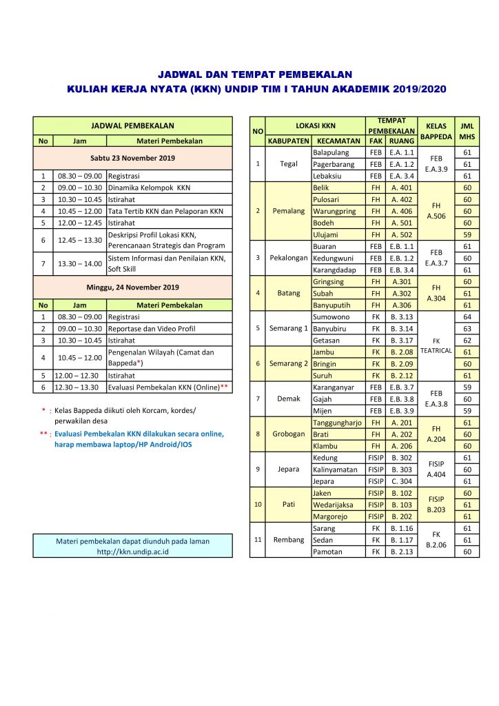 - Jadwal dan Tempat Pembekalan KKN Undip Tim I Tahun 2020