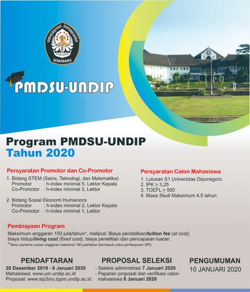 Diberitahukan bahwa Universitas Diponegoro pada Tahun 2020 akan membuka Program Pendidikan Magister menuju Doktor untuk Sarjana Unggul Universitas Diponegoro (PMDSU-UNDIP), program ini bertujuan untuk mengembangkan mutu pendidikan dan menghasilkan lulusan doktor bermutu tinggi serta meningkatkan kualitas dan sitasi publikasi internasional dari Universitas Diponegoro melalui target luaran jurnal internasional bereputasi tinggi (Q1 dan Q2). Program PMDSU-UNDIP ini dibiayai internal Undip dengan ketentuan sebagai berikut: