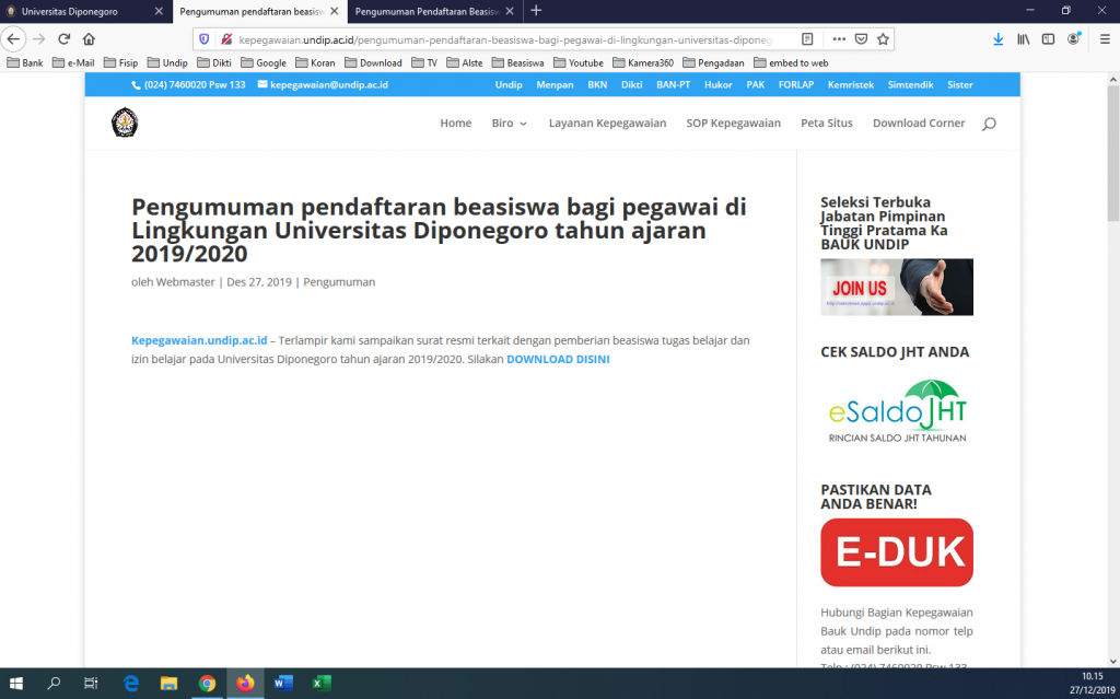 Pengumuman pendaftaran beasiswa bagi pegawai di Lingkungan Universitas Diponegoro tahun ajaran 2019/2020