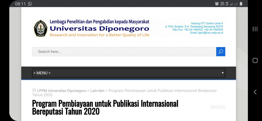 Diberitahukan dengan hormat bahwa LPPM Undip pada Tahun Anggaran 2020 membuka program pembiayaan untuk publikasi internasional bereputasi bagi dosen/peneliti di lingkungan Undip, adapun jenis program dan ketentuannya adalah sebagai berikut: 1. Program Pembiayaan Proof Reading untuk Publikasi Internasional: Program tidak dibatasi waktu pelaksanaannya, artikel yang didaftarkan akan diproses jika sudah mencapai 10 artikel; Mengumpulkan form pendaftaran (terlampir) […]