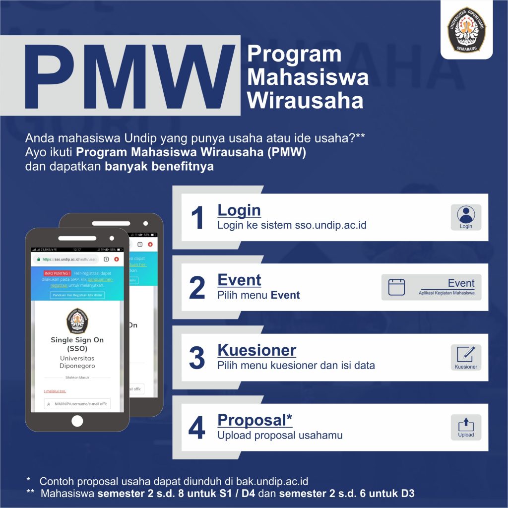 Dalam rangka membangun karakter wirausaha dan menumbuhkembangkan wirausaha-wirausaha baru yang berpendidikan tinggi serta memiliki pola pikir pencipta lapangan kerja. Universitas Diponegoro menyelenggarakan “Program Mhasiswa Wirausaha Tahun 2020“