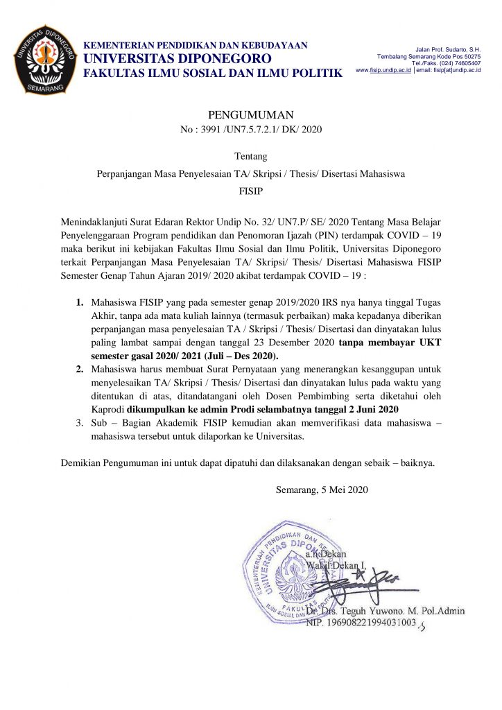 Perpanjangan Masa Penyelesaian TA/Skripsi/Thesis/Disertasi Mahasiswa FISIP