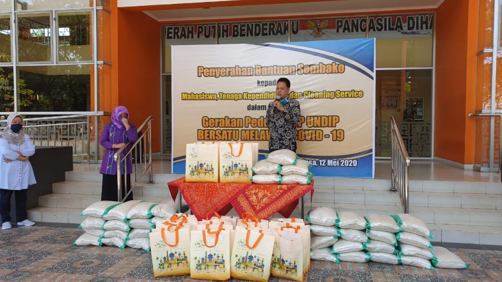 Masih dalam kegiatan yang sama dalam Gerakan Fakultas Peduli COVID-19, Dekan FISIP Undip Dr. Hardi Warsono, MTP., juga melakukan pembagian bingkisan paket sembako sebanyak 100 paket yang diserahkan secara simbolis pada hari Selasa (12/05). Bingkisan ini diberikan kepada para Tenaga Kependidikan (Tendik) sebanyak 68 orang, Cleaning Service (CS) sebanyak 16 (enam belas) orang, dan 16 (lima belas) mahasiswa Pasca Sarjana di lingkungan FISIP Undip. Paket sembako terdiri dari Beras 10 kg, Telur 1 kg, Minyak Goreng 1 Liter. Dr. Hardi Warsono, MTP menjelaskan kegiatan ini selain sebagai bagian dari Gerakan FISIP Peduli COVID-19, juga sebagai sebuah kegiatan rutin yang dilakukan setiap tahun sejak awal menjabat menjadi Dekan dan akan berlangsung setiap tahun sebagai bentuk rasa kebersamaan dan terima kasih kepada para Tendik dan Cleaning Service yang sudah bekerja secara maksimal demi kemajuan FISIP Undip tercinta.