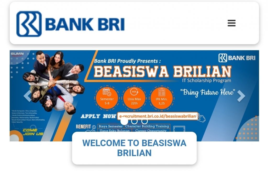 BRILiaN Scholarship “Bring Future Here” Inilah saatnya, tentukan masa depanmu sekarang. Dengan bergabung di BANK BRI, Bank BUMN terbaik di Indonesia. Memberikanmu kesempatan untuk membangun negeri. So, bring future here! Apa itu BRILiaN Scholarship? BRILiaN Scholarship adalah beasiswa yang diberikan kepada mahasiswa terpilih yang bertujuan untuk meningkatkan kompetensi Penerima BRILiaN Scholarship melalui program-program yang […]