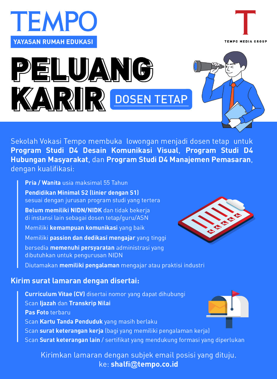 Sekolah Vokasi Tempo membuka lowongan menjadi dosen tetap Prodi: D4 DKV, D4 Humas, dan D4 Manajemen Pemasaran