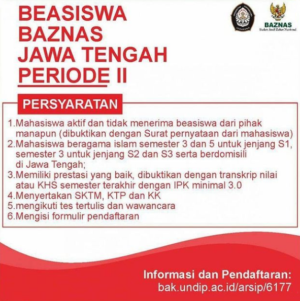 BAZNAS Provinsi Jawa Tengah akan menyelenggarakan pentasharufan beasiswa bagi Mahasiswa / Mahasiswi berprestasi kategori tidak mampu Periode II yang diawali seleksi calon penerima beasiswa oleh Pimpinan BAZNAS Provinsi Jawa Tengah di lingkungan Universitas.