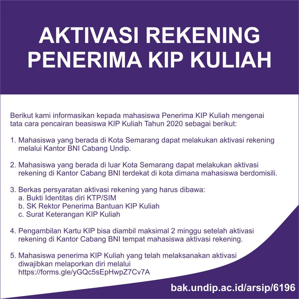 4. Pengambilan Kartu KIP bisa diambil maksimal 2 minggu setelah aktivasi rekening di Kantor Cabang BNI tempat mahasiswa aktivasi rekening.