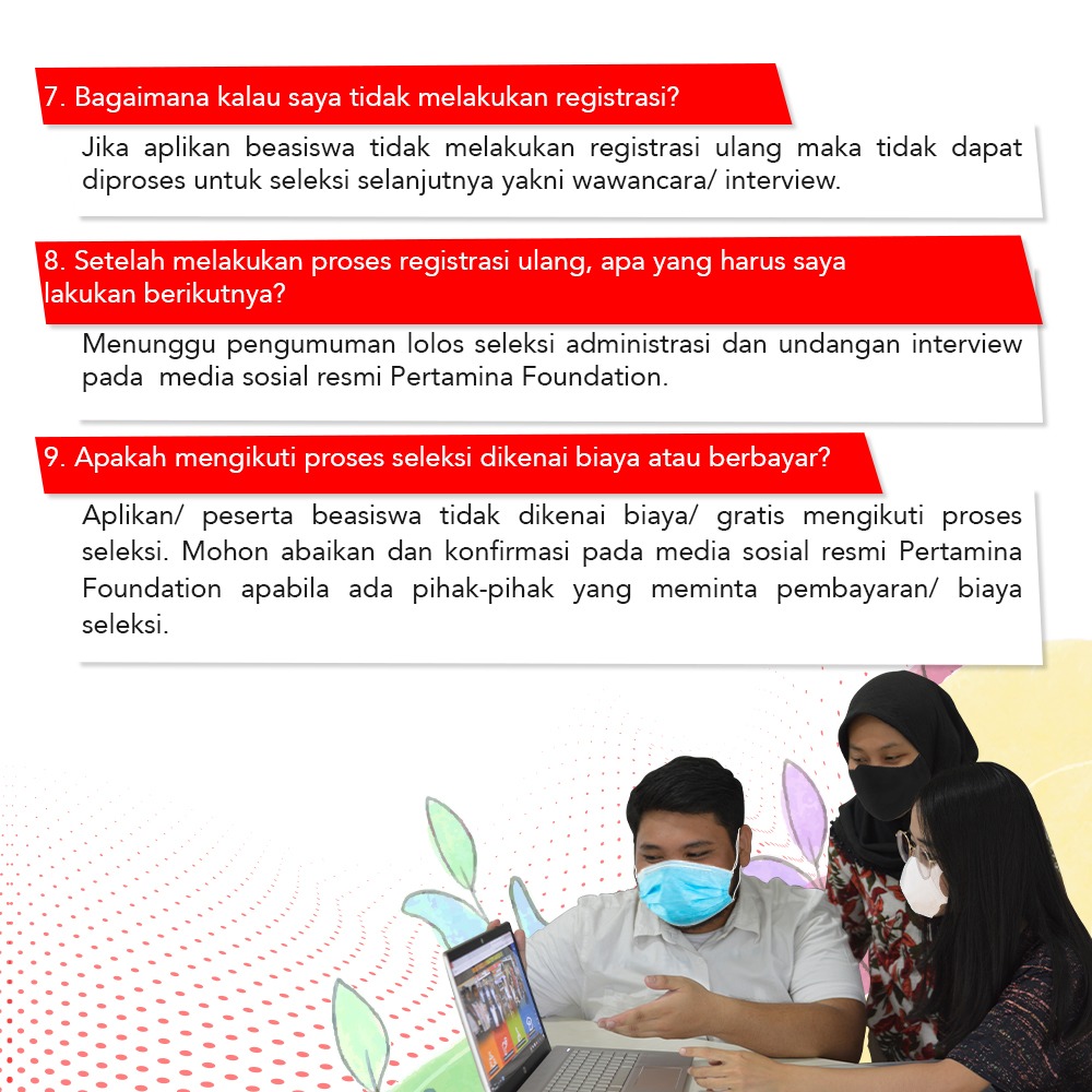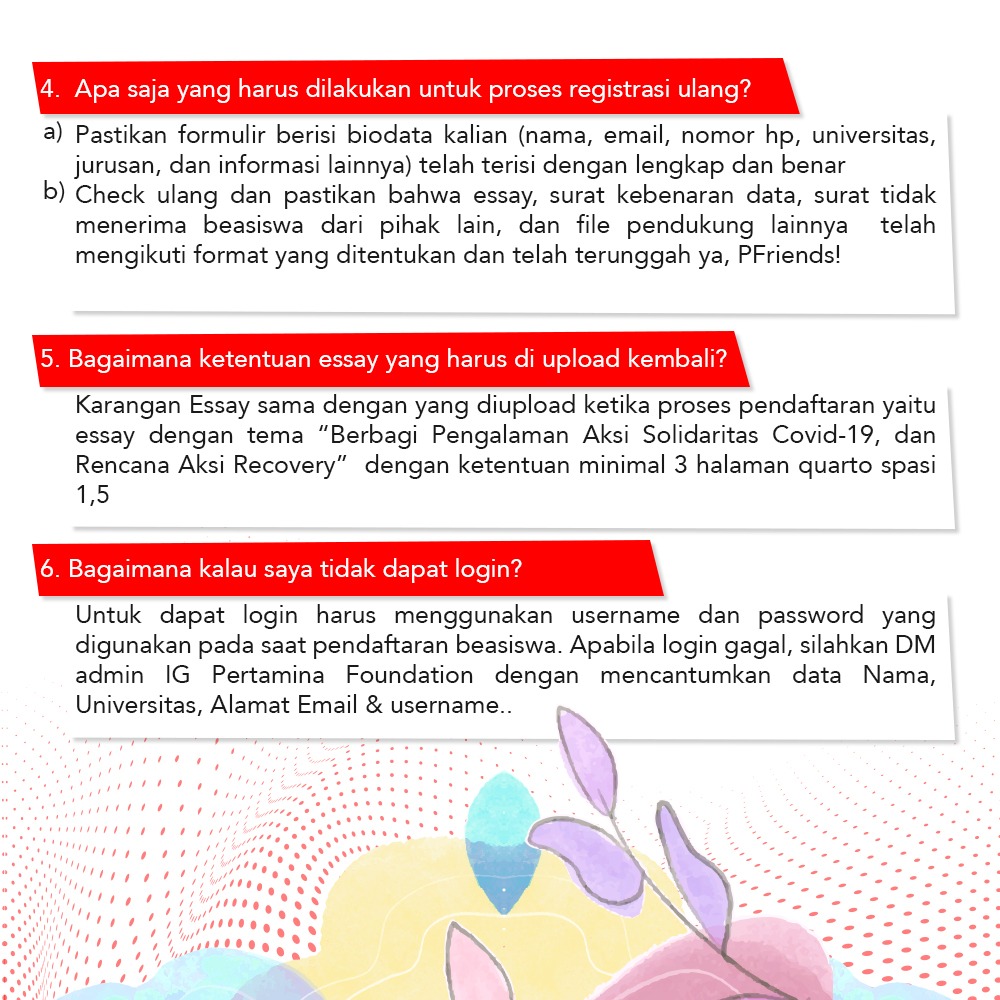 Menindaklanjuti arahan dari Pertamina Foundation, diberitahukan kepada mahasiswa yang telah mendaftar beasiswa Pertamina Foundation untuk kembali mengecek dan mengkonfirmasi kelengkapan data yang telah disubmit melalui tahapan registrasi ulang dengan ketentuan sebagai berikut: