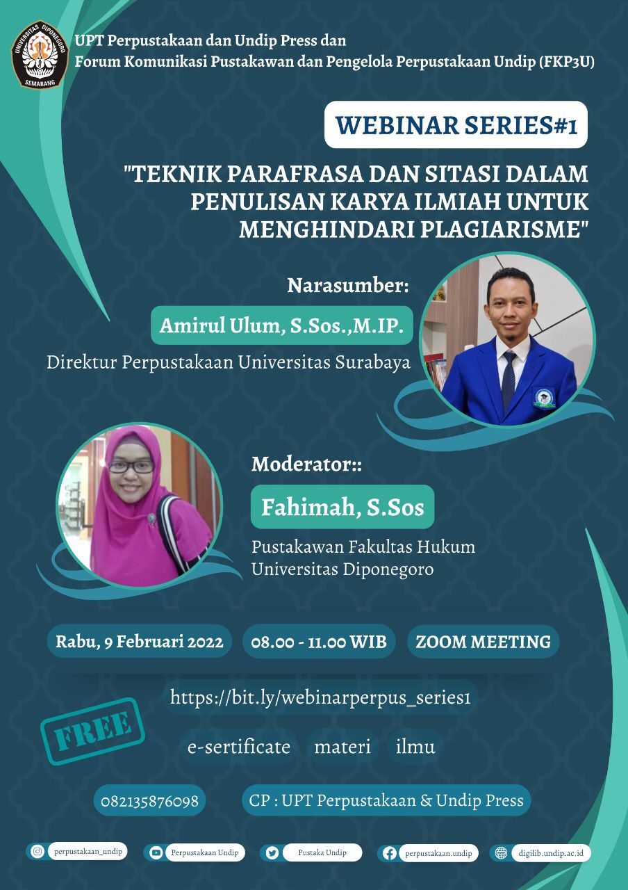 WEBINAR SERIES #1: TEKNIK PARAFRASA DAN SITASI DALAM PENULISAN KARYA ILMIAH UNTUK MENGHINDARI PLAGIARISME Plagiarisme menjadi isu penting dalam dunia akademis. Setiap akademisi pasti akan berusaha untuk menjaga integritasnya dengan menghindari praktik plagiasi. Setidaknya ada dua hal yang bisa membantu orang menghindari plagiasi, yakni melakukan parafrasa dan melakukan sitasi secara tepat dalam penulisan karya ilmiah. […]