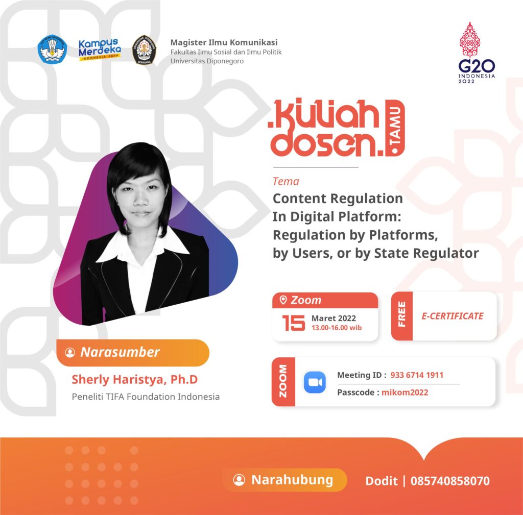 Magister Ilmu Komunikasi, Fakultas Ilmu Sosial dan Ilmu Politik Universitas Diponegoro menghadirkan Sherly Haristya, Ph.D., Peneliti TIFA Foundation Indonesia sebagai narasumber dalam acara Kuliah Dosen Tamu dengan tema “Content Regulation In Digital Platform: Regulation by Platform , by User, or by State Regulator” (15/3) Materi yang disampaikan memberikan gambaran tentang dinamika kekuasaan, isu-isu kunci, dan […]