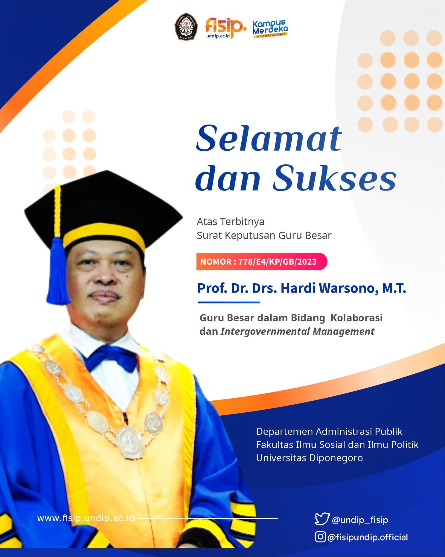 Selamat dan sukses atas Terbitnya SK Guru Besar Prof. Dr. Drs. Hardi Warsono, MT.