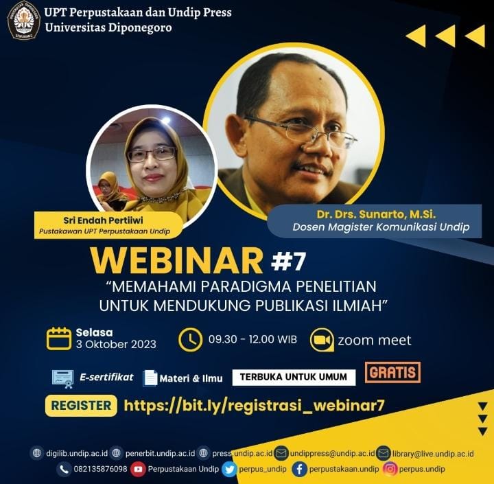 Webinar “Memahami Paradigma Penelitian untuk Mendukung Publikasi Ilmiah” yang diselenggarakan oleh UPT Perpustakaan dan Undip Press Universitas Diponegoro adalah sebuah acara online yang bertujuan untuk memberikan pemahaman yang mendalam tentang paradigma penelitian dan bagaimana paradigma ini dapat mendukung proses publikasi ilmiah. Webinar ini akan membahas konsep-konsep dasar dalam penelitian, peran paradigma dalam merancang penelitian, serta […]