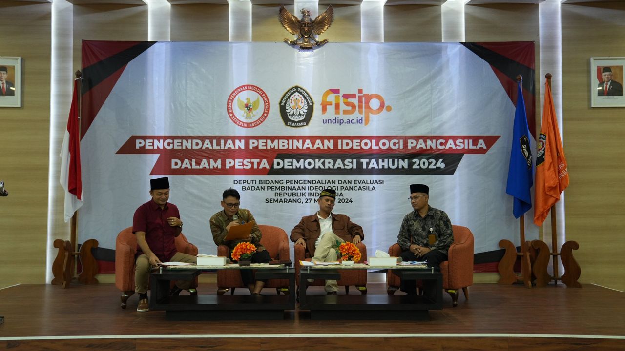 Semarang (27/03) – Fakultas Ilmu Sosial dan Ilmu Politik (FISIP) Universitas Diponegoro (Undip) telah menyelenggarakan kegiatan bersama dengan Badan Pembinaan Ideologi Pancasila (BPIP) dengan tema acara “Pengendalian Pembinaan Ideologi Pancasila Dalam Pesta Demokrasi 2024.” Acara ini dilaksanakan pada hari Rabu, 27 Maret 2024 di Ruang Auditorium FISIP Undip. Acara ini dibuka oleh Dr. Adhianti, S.IP., M.Si, selaku Sekretaris Utama BPIP serta Dr. Drs. Teguh Yuwono, M.Pol.Admin selaku Dekan FISIP Undip. Acara ini mengundang beberapa narasumber seperti Bapak Handi Tri Ujiono, S.Sos. selaku Ketua Komisi Pemilihan Umum (KPU) Jawa Tengah, Bapak Drs. Teguh Yuwono, M.Pol.Admin selaku Dekan FISIP Undip, serta Bapak Muhammad Amin, S. AP., MH. selaku Ketua Badan Pengawas Pemilihan Umum (Bawaslu) Jawa Tengah. Acara ceramah umum tersebut dihadiri oleh civitas akademika di lingkungan FISIP Undip dan berjumlah kurang lebih 200 peserta.