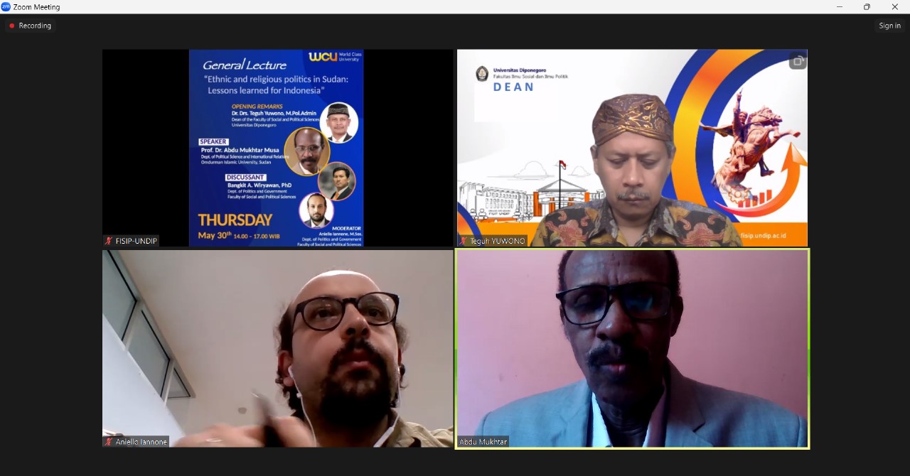 Pada hari Kamis, 30 Mei 2024, Unit Urusan Internasional FISIP Undip menyelenggarakan Kuliah Dosen Tamu dengan tema “Ethnic and Religious Politics in Sudan: Lessons Learned for Indonesia” secara online melalui aplikasi Zoom Meeting. Kegiatan ini menghadirkan narasumber dari luar negeri, yaitu Prof. Dr. Abdu Mukhtar Musa dari Omdurman Islamic University, Sudan.