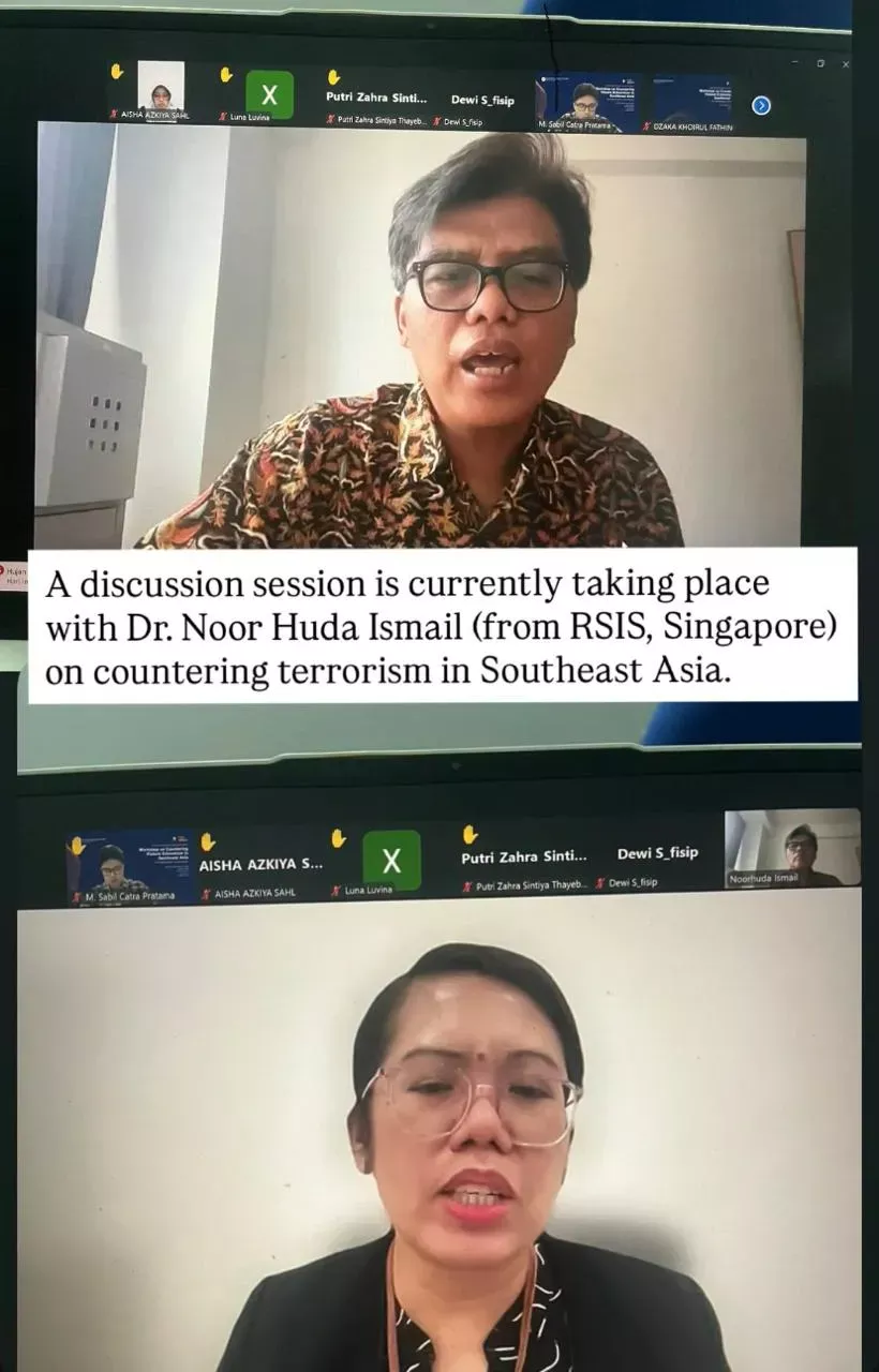 Acara ini menghadirkan Dr. Noor Huda Ismail (Visiting Fellow, S. Rajaratnam School of International Studies – RSIS, Singapura), seorang peneliti dan praktisi yang dikenal luas atas karyanya mengenai isu radikalisasi, deradikalisasi, serta reintegrasi mantan pelaku terorisme. Diskusi dipandu oleh Nadia Farabi, Ph.D., dosen Hubungan Internasional UNDIP.