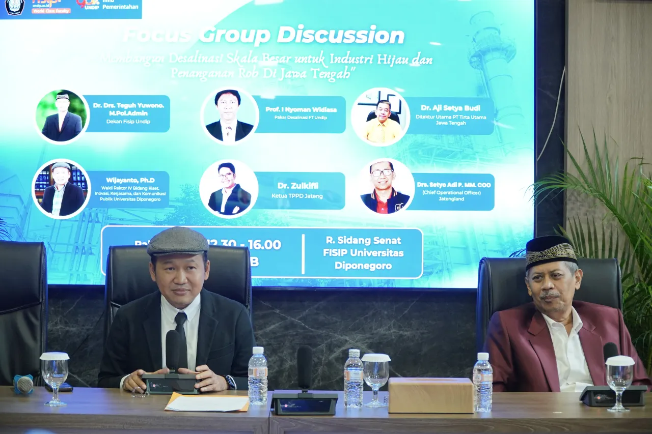 29 Oktober 2025 – Menjawab tantangan besar di Jawa Tengah, yakni masalah rob dan kebutuhan air bersih industri, Departemen Politik dan Ilmu Pemerintahan FISIP Undip menyelenggarakan Focus Group Discussion (FGD) strategis. Acara ini mengusung tema “Membangun Desalinasi Skala Besar untuk Industri Hijau dan Penanganan Rob Di Pantura Jawa Tengah”.