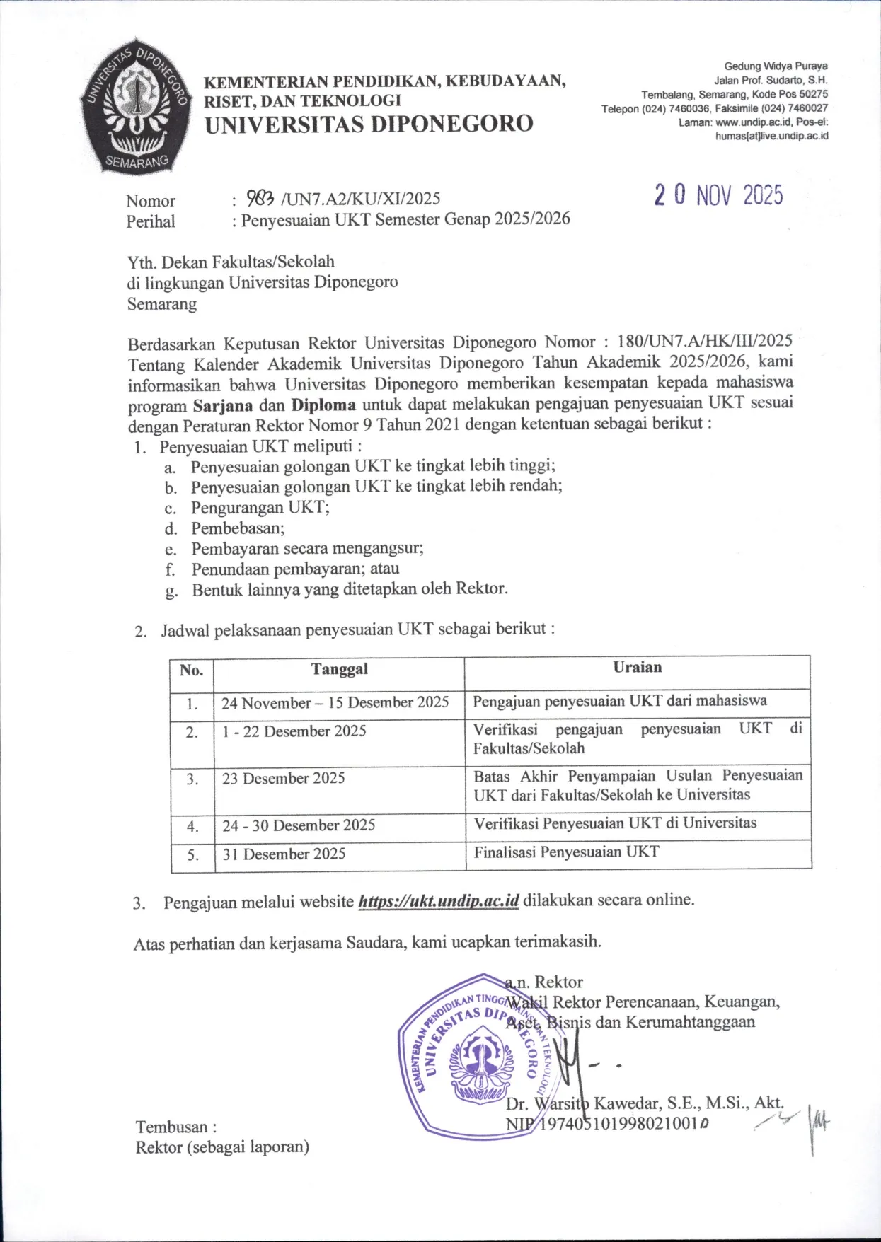 Universitas Diponegoro (UNDIP) resmi membuka pengajuan penyesuaian UKT (Uang Kuliah Tunggal) untuk Semester Genap Tahun Akademik 2025/2026. Kesempatan ini berlaku bagi mahasiswa program Sarjana dan Diploma sesuai dengan Peraturan Rektor Nomor 9 Tahun 2021.