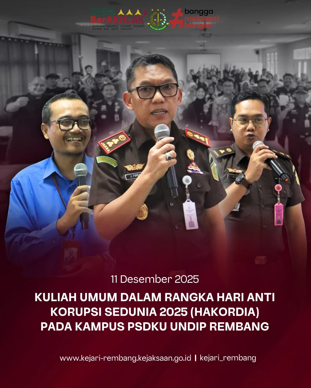 Kamis, 11 Desember 2025 lalu Kejaksaan Negeri (Kejari) Rembang bekerja sama dengan Program Studi S1 Administrasi Publik, Fakultas Ilmu Sosial & Ilmu Politik (FISIP) Universitas Diponegoro (Undip) menyelenggarakan Kuliah Umum berkaitan dengan anti korupsi. Kegiatan ini diselenggarakan dalam rangka memperingati Hari Anti Korupsi Sedunia (Hakordia) Tahun 2025, dengan tema “Berantas Korupsi untuk Kemakmuran Rakyat.” Kegiatan Kuliah Umum ini sejalan dengan pembangunan Zona Integritas menuju Wilayah Bebas dari Korupsi (WBK) dan Wilayah Birokrasi Bersih dan Melayani (WBBM) di FISIP UNDIP.