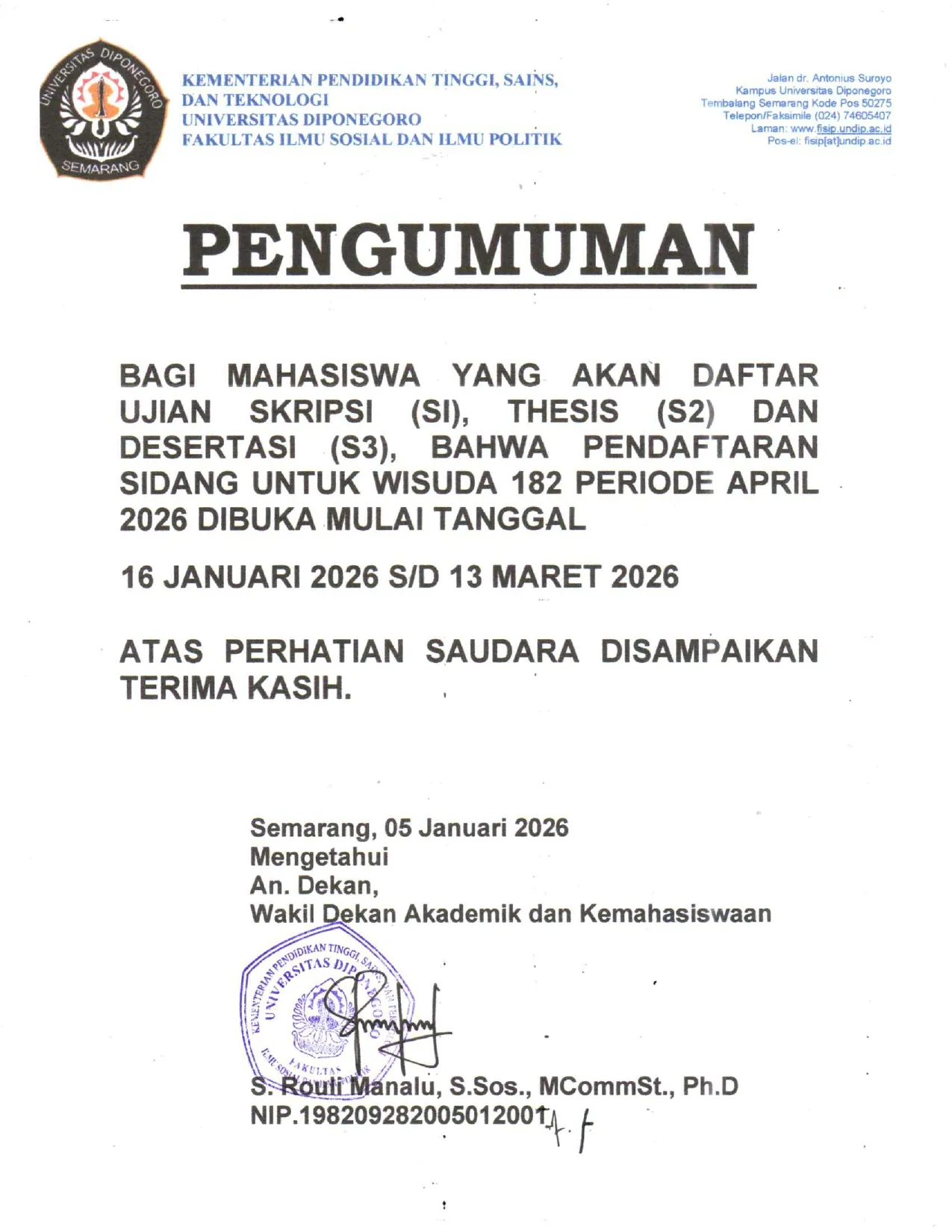 Semarang, 6 Januari 2026 – Fakultas telah membuka pendaftaran ujian akhir bagi mahasiswa program sarjana (S1), magister (S2), dan doktor (S3) yang akan mengikuti prosesi Wisuda 182 pada periode April 2026. Pendaftaran dapat dilakukan mulai 16 Januari 2026 hingga 13 Maret 2026.