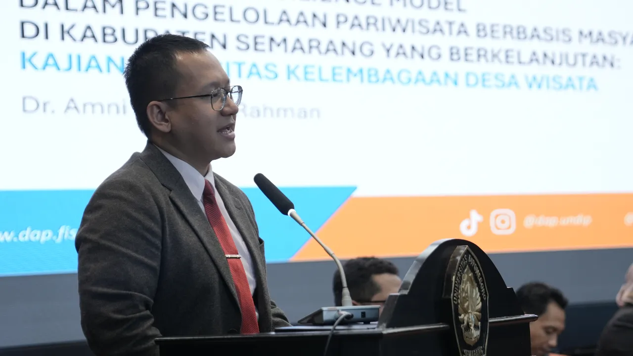 Sesi 2 ditutup oleh Dr. Amni Zarkasyi Rahman, S.A.P., M.Si., lulusan Program Doktor Administrasi Publik Universitas Diponegoro, dosen Administrasi Publik UNDIP dengan orasi ilmiah berjudul “Institutional Resilience Model dalam Pengelolaan Pariwisata Berbasis Masyarakat di Kabupaten Semarang yang Berkelanjutan: Kajian Kapasitas Kelembagaan Desa Wisata.”Orasi ini menegaskan kontribusi keilmuan UNDIP dalam mendukung pembangunan daerah melalui penguatan kapasitas kelembagaan desa wisata yang adaptif dan berorientasi pada kesejahteraan masyarakat.