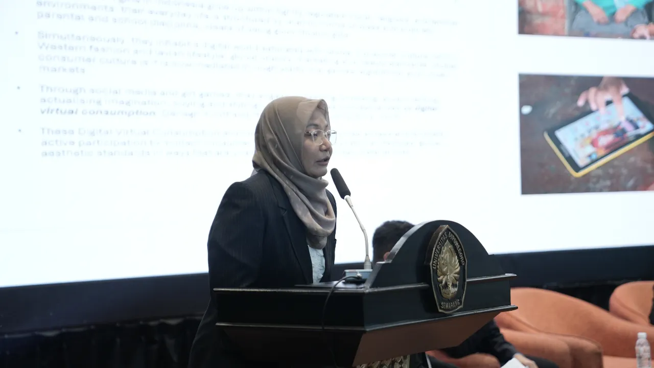 Selanjutnya, Dr. Nurist Surayya Ulfa, S.Sos., M.Si., Ph.D., dosen dari Departemen Ilmu Komunikasi lulusan Bournemouth University, Inggris, menyampaikan orasi berjudul “Digital Virtual Mediation and the Formation of Jilbab Girls as Modern Consumers Subjects.” Orasi ini merefleksikan dinamika identitas dan budaya digital, sekaligus menegaskan pentingnya literasi media agar masyarakat semakin berdaya di era transformasi digital.