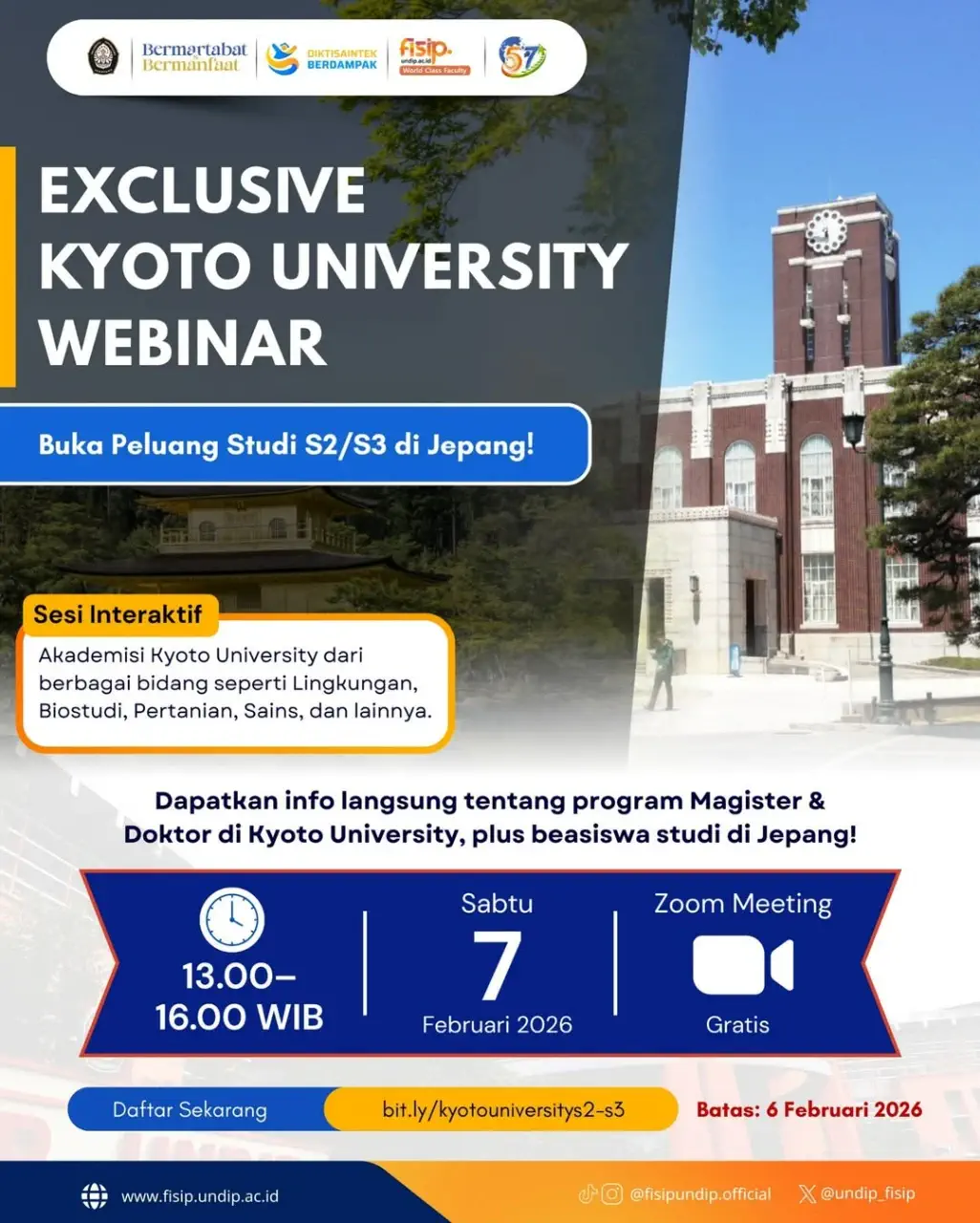 Fakultas Ilmu Sosial dan Ilmu Politik Universitas Diponegoro menyelenggarakan Exclusive Kyoto University Webinar sebagai upaya membuka wawasan dan peluang studi lanjut di Jepang.