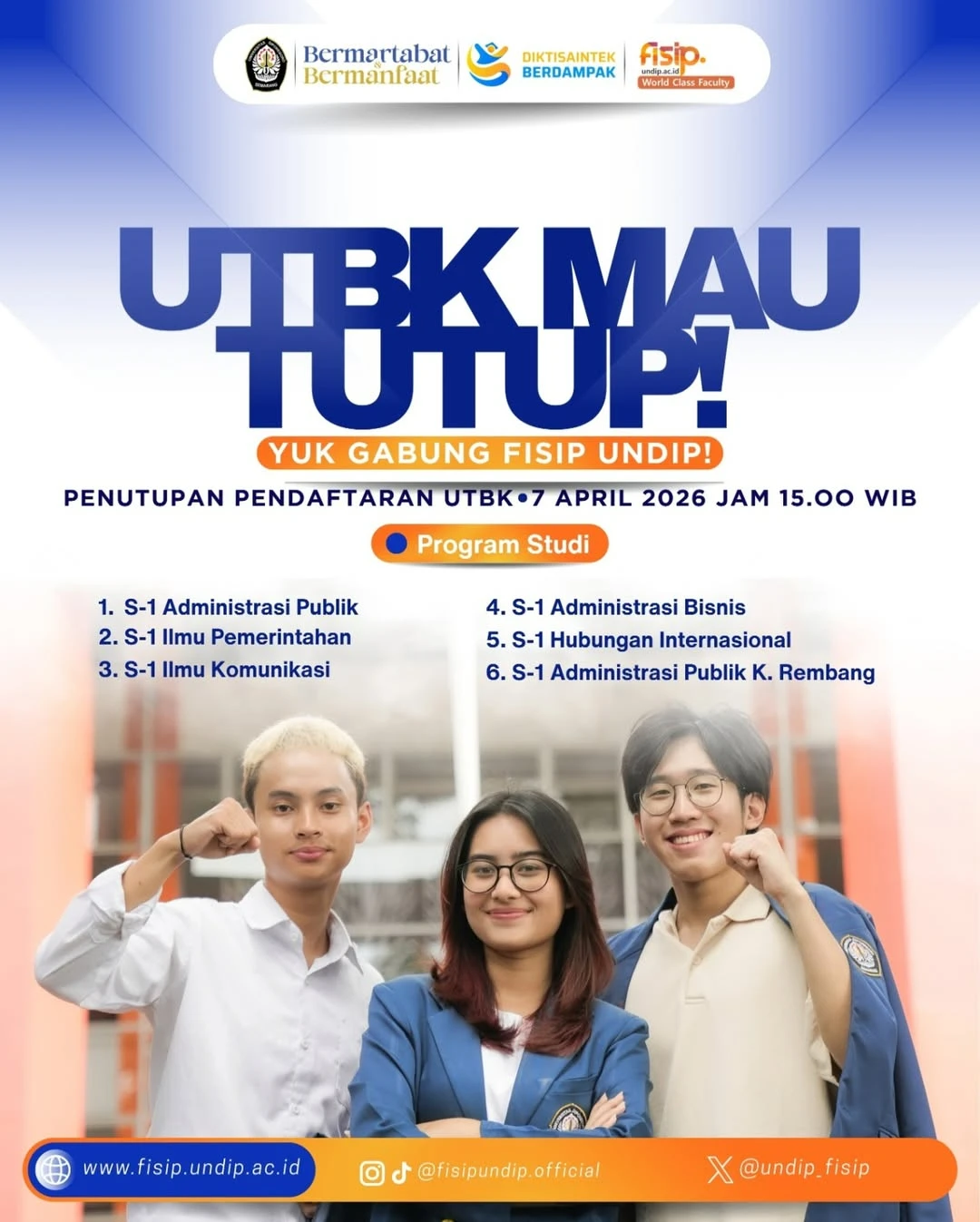 Semarang, 7 April 2026 – Fakultas Ilmu Sosial dan Ilmu Politik (FISIP) Universitas Diponegoro mengingatkan kepada seluruh calon mahasiswa bahwa pendaftaran jalur UTBK (Ujian Tulis Berbasis Komputer) akan ditutup hari ini, Senin, 7 April 2026 pukul 15.00 WIB.