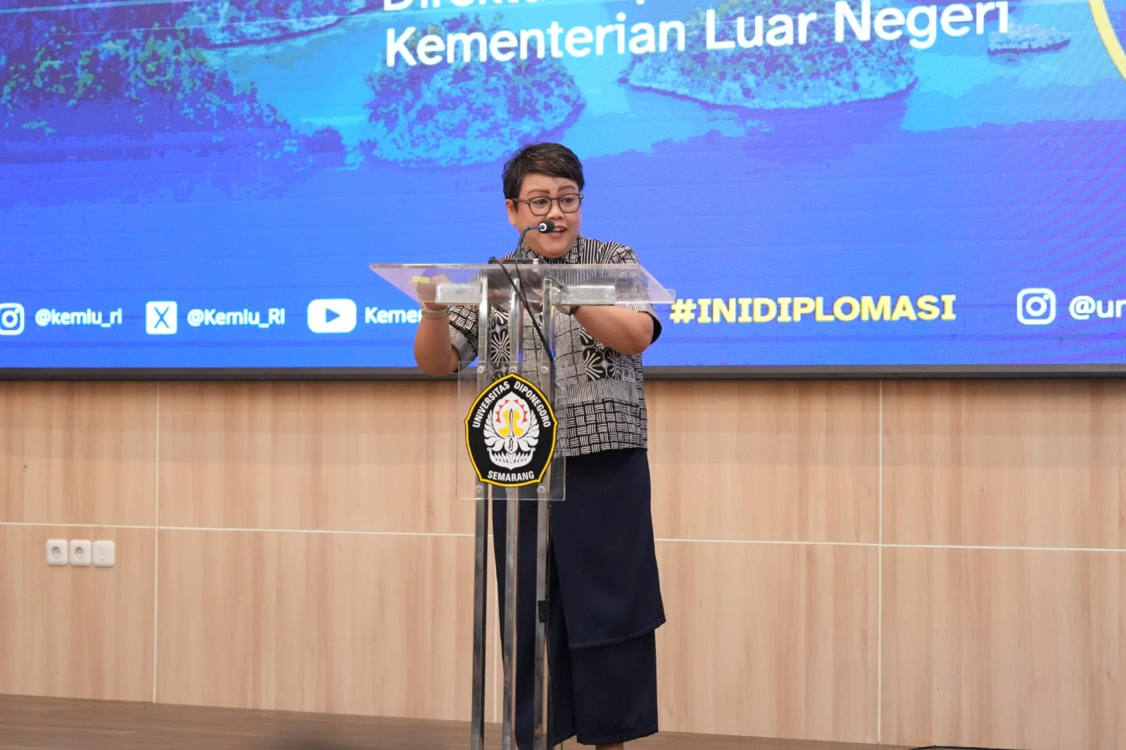 Sambutan berikutnya disampaikan oleh Ani Nigeriawati, Direktur Diplomasi Publik Kementerian Luar Negeri Republik Indonesia sekaligus alumni Program Studi Ilmu Komunikasi FISIP UNDIP. Ia menekankan bahwa diplomasi publik merupakan instrumen penting soft power Indonesia dalam memperkuat posisi negara di kancah global, khususnya dalam isu kedaulatan dan hukum laut.
