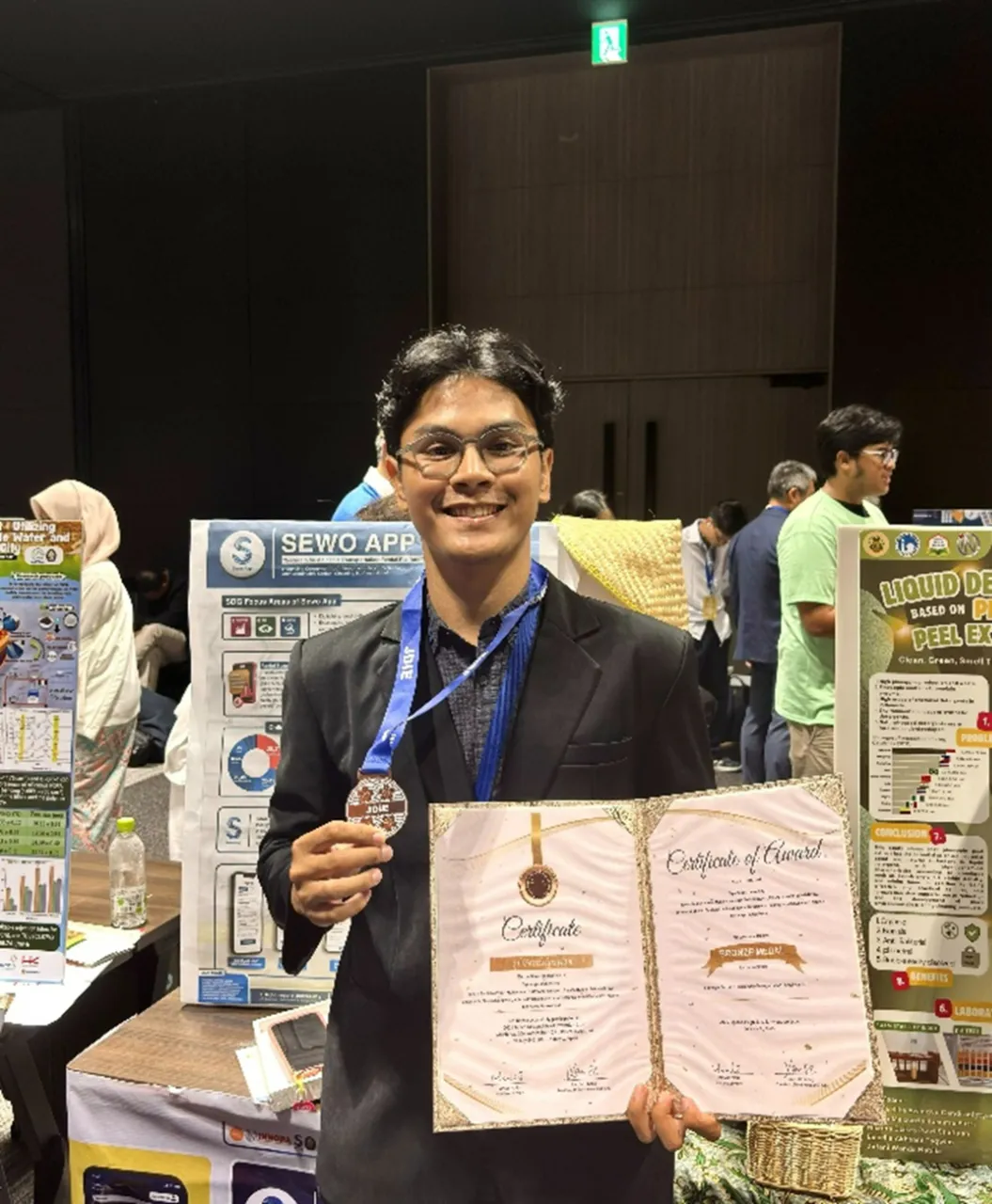 Achmad Yassar Dwilaksono from the Faculty of Social and Political Sciences (FISIP) at Universitas Diponegoro (Undip), along with his team members—Talitha Zarifah Anwar (FISIP), Muhammad Rizky Andreansyach (FISIP), Sabrina Isyaah Saharany (FISIP), Hasna Nur Aini Fatihah Rizky (Faculty of Medicine), and Emanuella Sharen Gunawan (FISIP)—successfully earned a Bronze Medal at the Japan Design Idea Invention Expo 2025, held on July 5–6, 2025 at Bellesalle Haneda Airport, Tokyo.