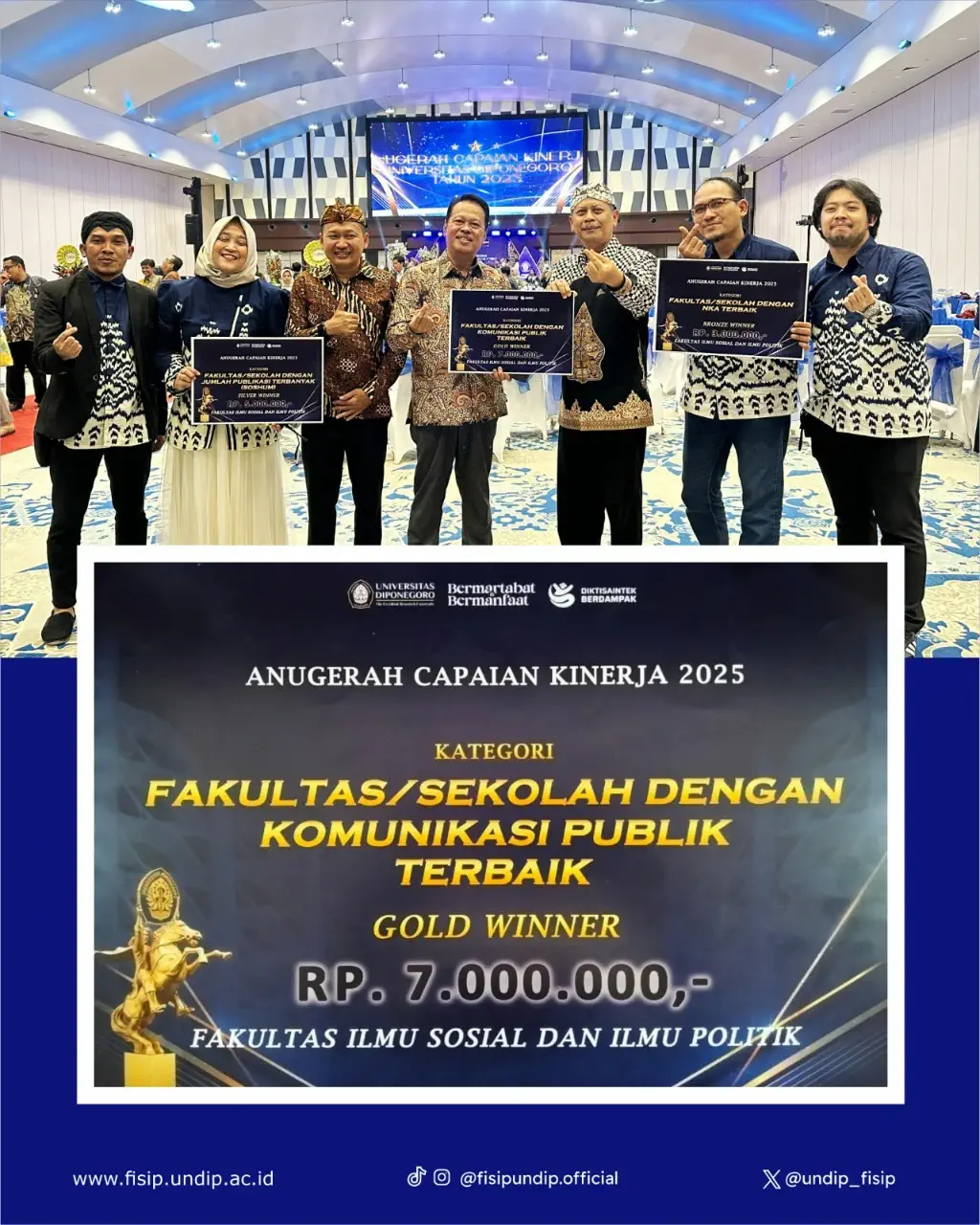 These awards serve as tangible proof of the strong synergy between the faculty leadership, lecturers, administrative staff, students, and supporting units in building an excellent and globally competitive faculty. Moving forward, FISIP Undip remains steadfast in its commitment to strengthening the performance of the university’s tri dharma (three pillars: education, research, and community service), enhancing the quality of international research and publications, and developing inclusive and impactful public communication.