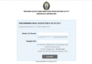 Rektor Universitas Diponegoro dengan ini mengumumkan bagi peserta yang dinyatakan lolos seleksi sebagai calon mahasiswa baru program Diploma III Universitas Diponegoro melalui jalur PROGRAM SELEKSI SISWA BERPOTENSI (PSSB) Tahun Akademik 2017/ 2018, wajib melaksanakan rangkaian kegiatan sebagai berikut: Melaksanakan registrasi secara online di http://reg-online.undip.ac.id/ pada