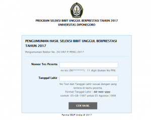 Rektor Universitas Diponegoro dengan ini mengumumkan bahwa sesuai SK Rektor No: 21/UN7.P/PENG/2017 peserta yang lolos seleksi berkas (administrasi dan akademik) Universitas DiponegoroTahun Akademik 2017/2018 dimohon dapat mengikuti seleksi bakat yang akan dilaksanakan pada : Hari/Tanggal : Senin-Rabu/22 – 24 Mei 2017 Waktu : 08.00 WIB – selesai Lokasi : Gedung