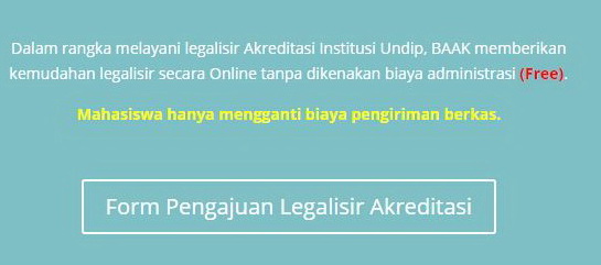 Formulir Pengajuan Legalisir Akreditasi Universitas Diponegoro Semarang secara Online. Setiap mahasiswa yang akan mengajukan legalisir secara online tidak dikenakan biaya administrasi (Free). Mahasiswa hanya mengganti biaya pengiriman berkas. Untuk pengiriman akan dilayani pada hari dan jam kerja. Klik di sini untuk Form Pengajuan Legalisir Akreditasi sumber : https://baa.undip.ac.id