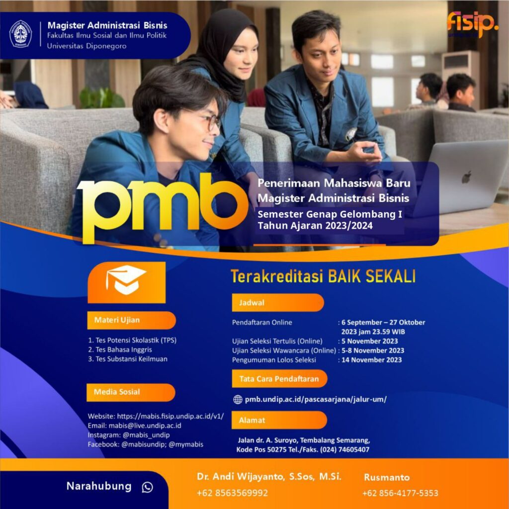 Prodi Magister Administrasi Bisnis kembali membuka Seleksi Penerimaan Mahasiswa Baru melalui Ujian Mandiri Pascasarjana Semester Genap Gelombang 1 pada Tahun Akademik 2023/2024. Seleksi diselenggarakan secara terpadu di sistem pendaftaran Ujian Mandiri, yang dikelola oleh Lembaga Pengembangan dan Penjaminan Mutu Pendidikan (LP2MP) Universitas Diponegoro. Pendaftaran Online Pendaftaran Online : 6 September – 27 Oktober 2023 jam 23.59 WIB […]
